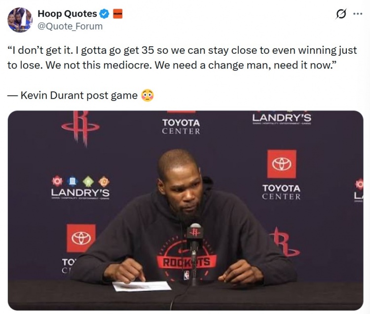 赛后,美媒Hoop Quotes晒出了杜兰特的赛后采访,他说道:“我不明白。我必须拿到35分才能勉强保持比赛的悬念,结果还是输球。我们不应该这么平庸。我们需要改变,现在就需要。哦不,我得去做我的工作了。无论输赢,我还是能拿到数百万的报酬。”